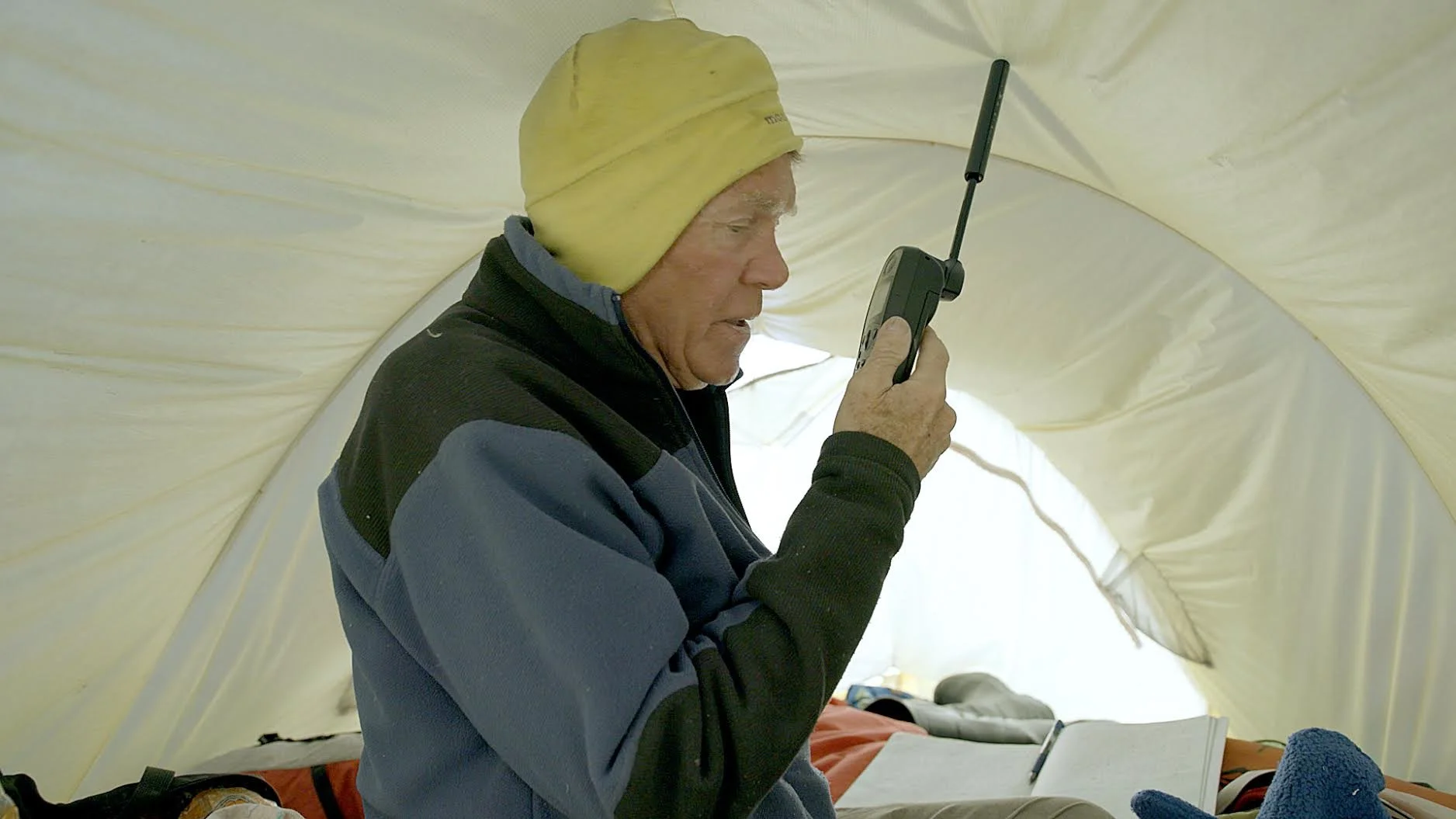 Will sends in his daily dispatches over satellite phone. This shot was taken as part of his 2023 expedition.