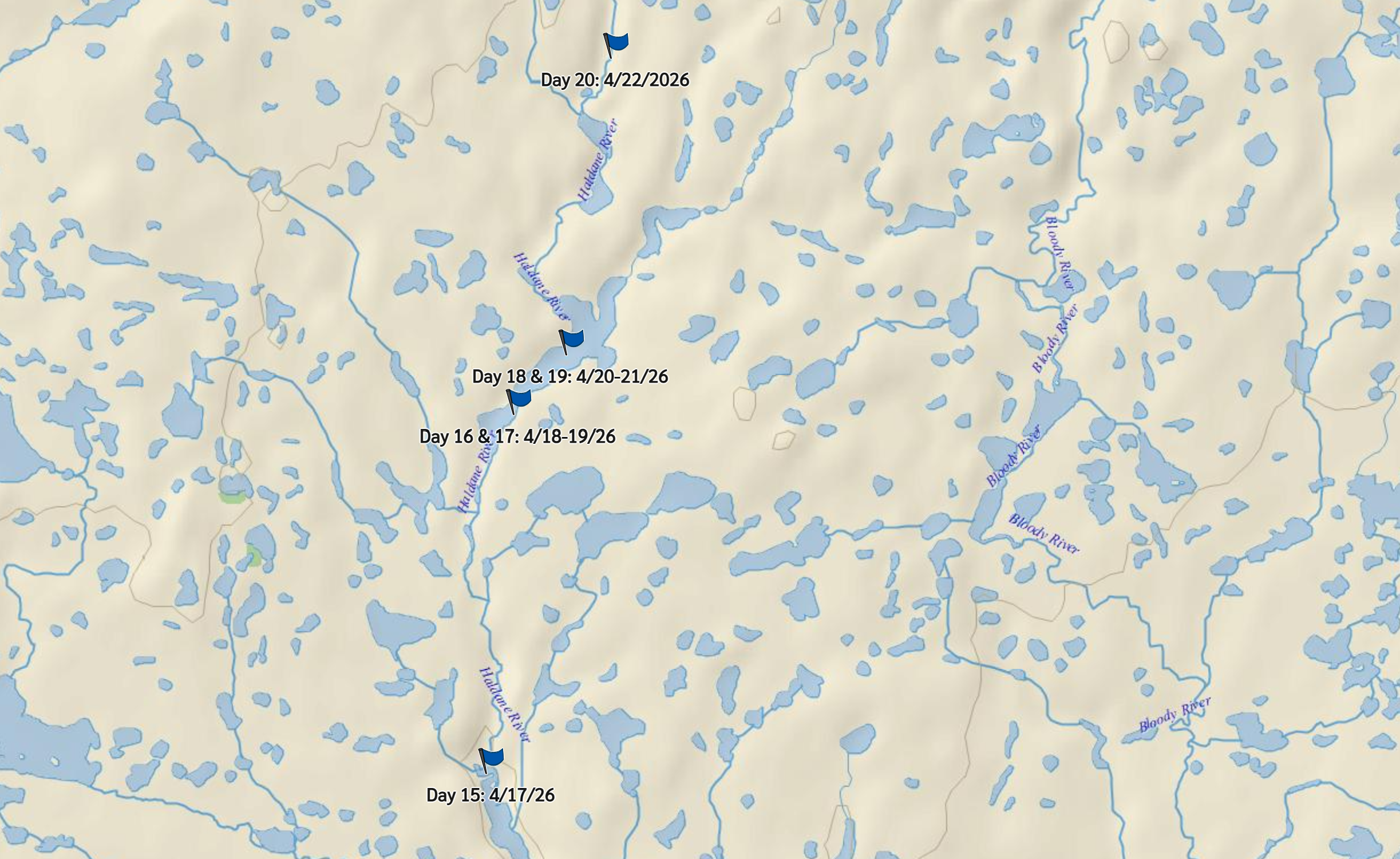 Will’s location at the end of Day 20, Earth Day 2026. He advanced a second load to his forward position and will return to get a third, final load to bring forward as he nears the divide between the Haldane and the Horton rivers. Visit Will’s interactive map for complete control of magnification and orientation.