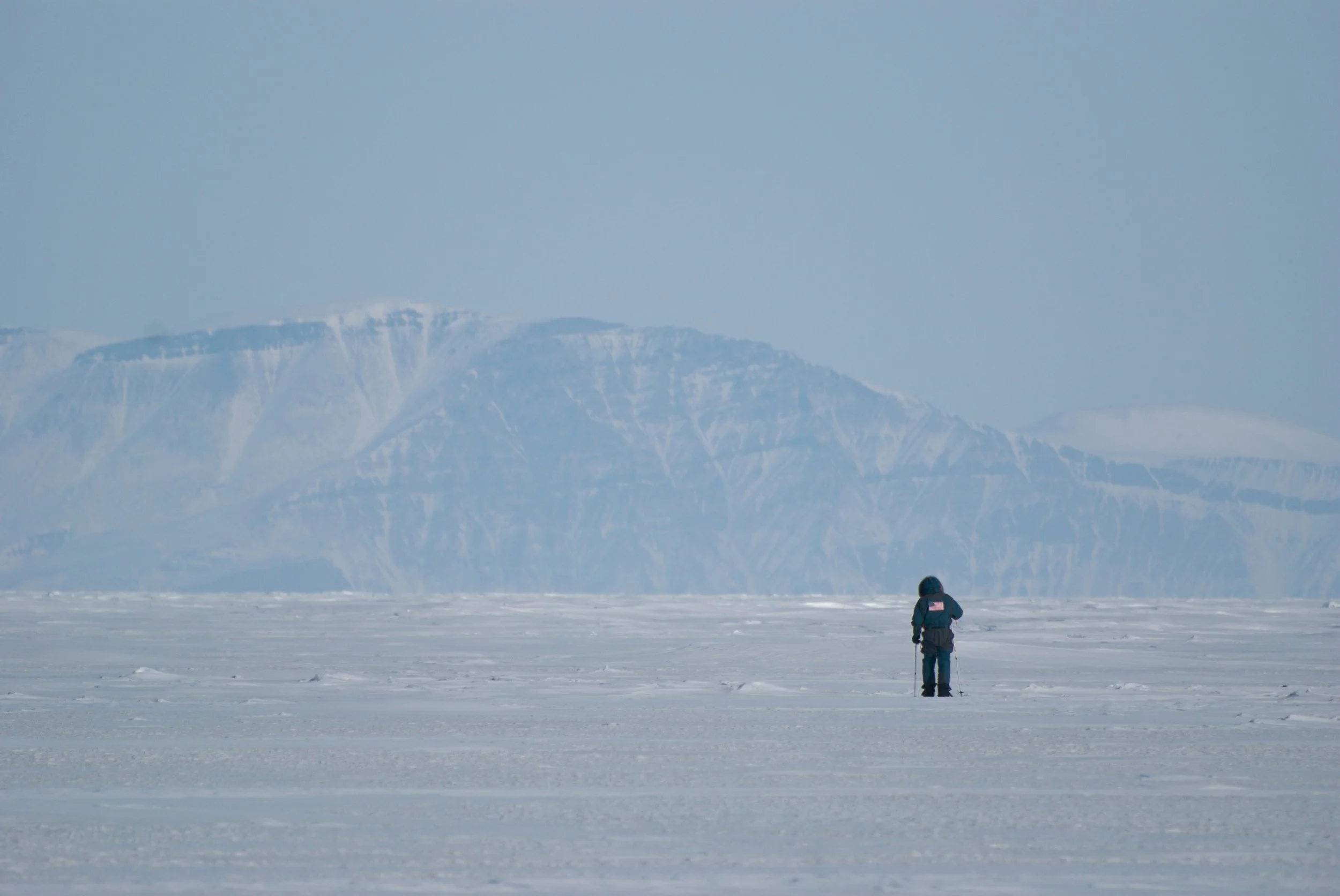 Will skiing solo on the 2008 Ellesmere Island Expedition. Will has been making several trips forward and back to camp (relaying) to shuttle loads forward, using ski pole tracks to navigate one run during dangerous whiteout conditions today.